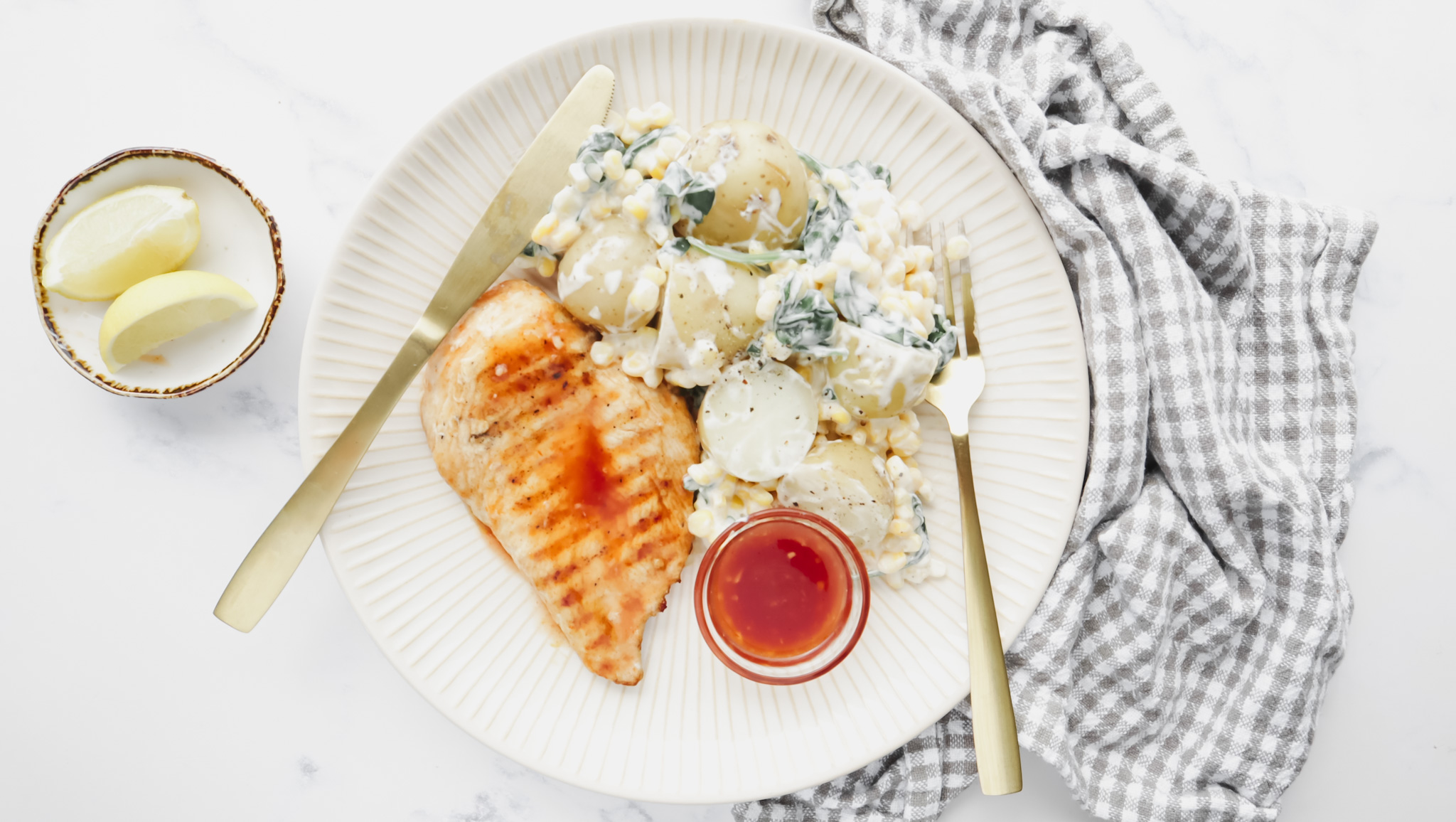 Grilled barbecue chicken with creamy corn & potato salad