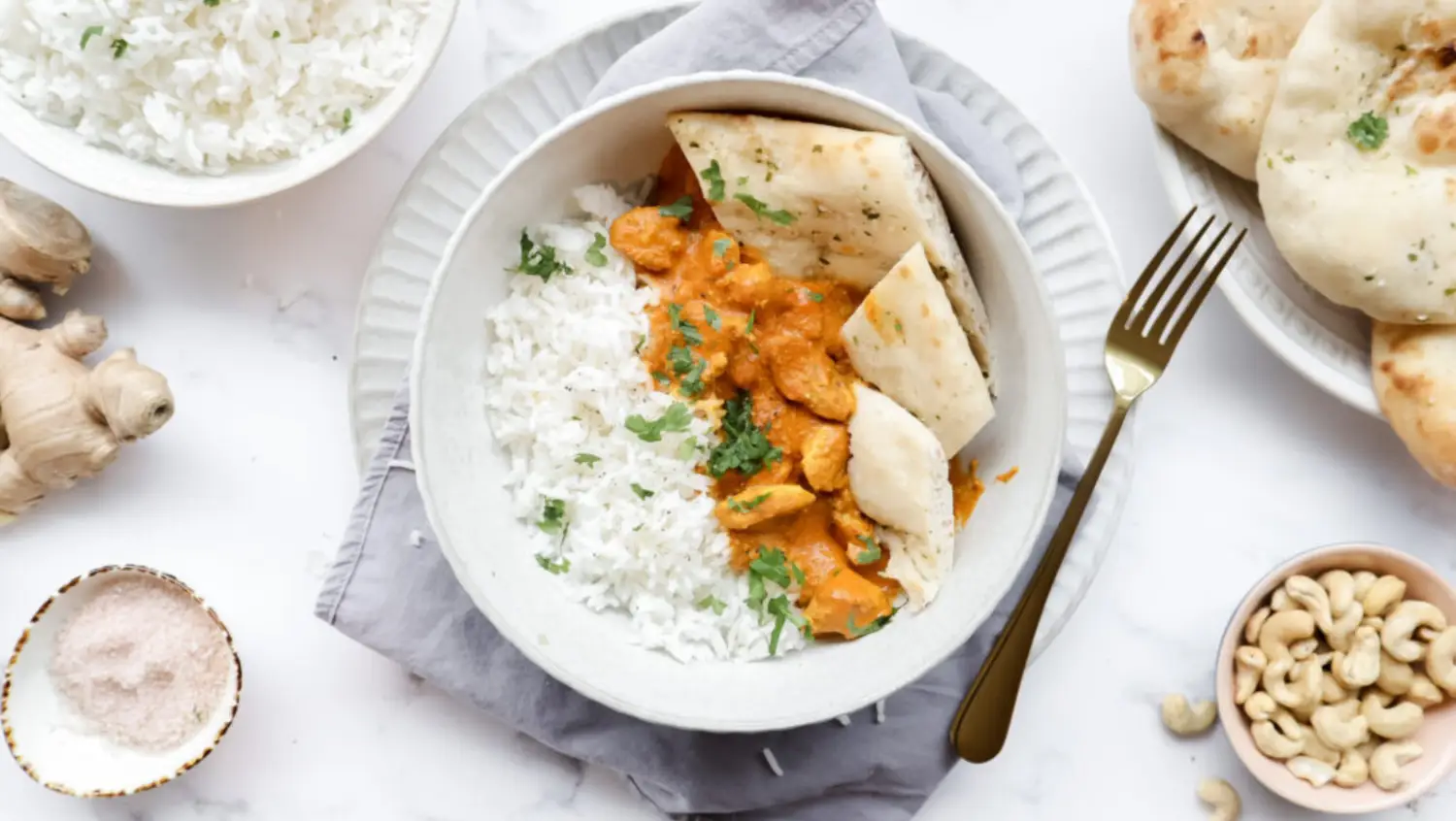 Healthier butterless chicken with basmati rice & garlic naan bread