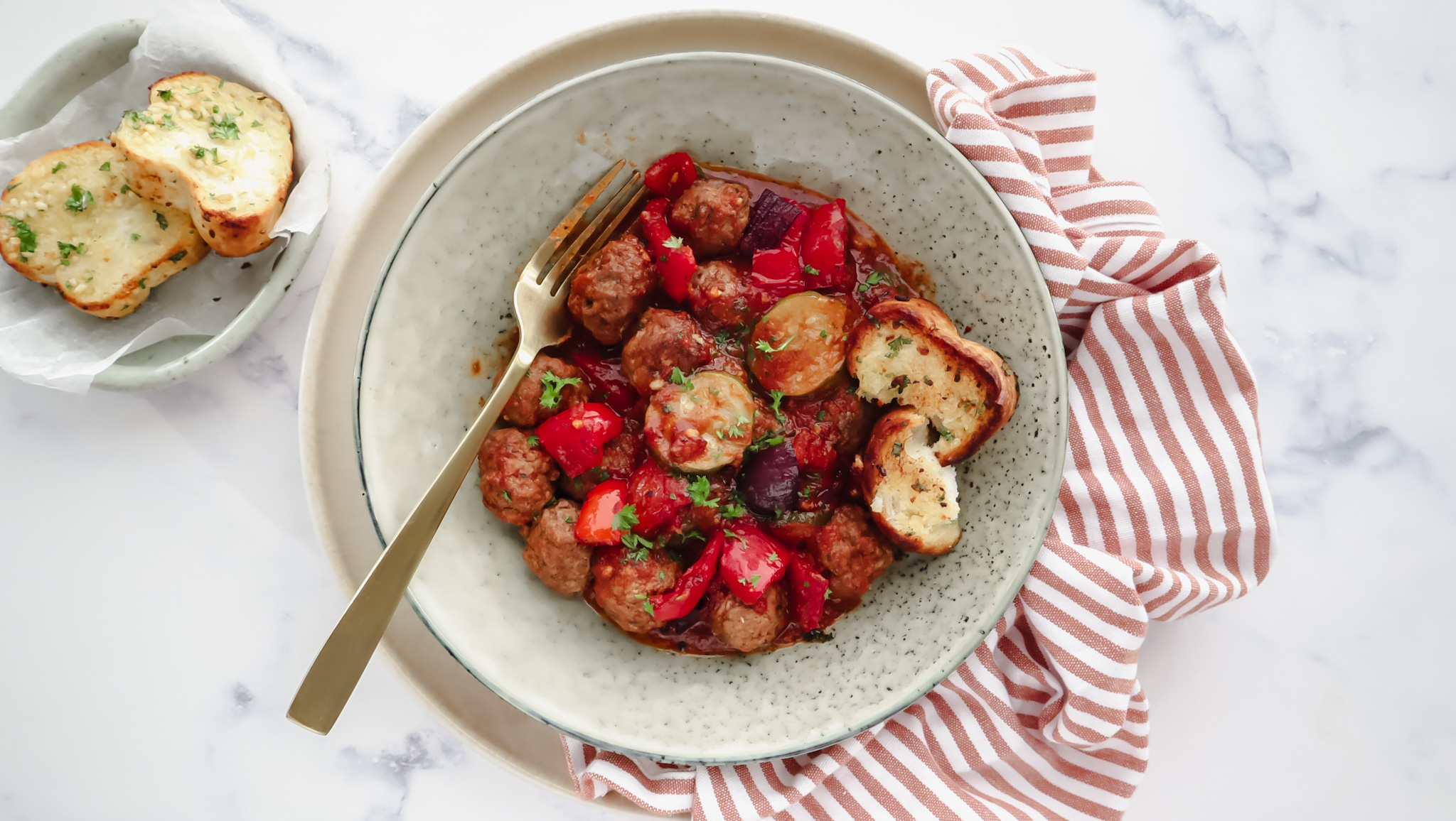 Veggie, tomato & lamb meatballs with garlic bread
