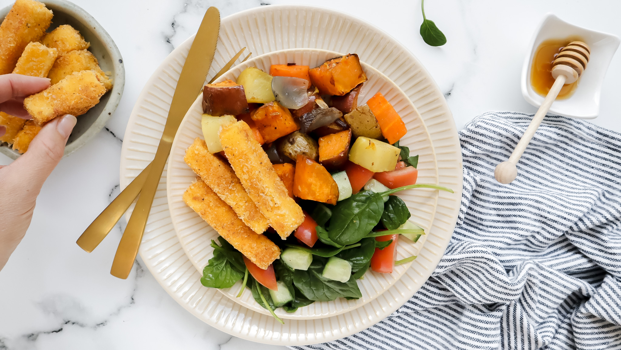 Moroccan crumbed haloumi with honey roasties salad & sweet chilli mayo