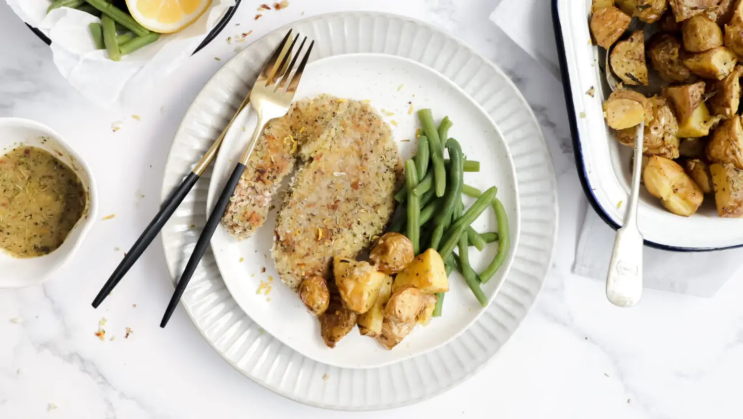 Crispy parmesan pork fillets with garlic roasties, greens & aioli