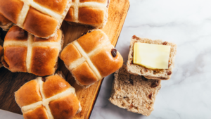 Meanwhile, place 1 tbsp apricot jam and 2 tsp water in a small bowl, and microwave for 30 seconds. Mix to combine. Brush buns with jam mixture while warm. Allow to cool to warm before serving.
