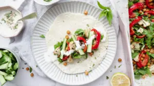 Divide the tortillas among plates. Spread with the lemon and mint yoghurt dressing, then fill with the vegetable mixture, cucumber and remaining mint.